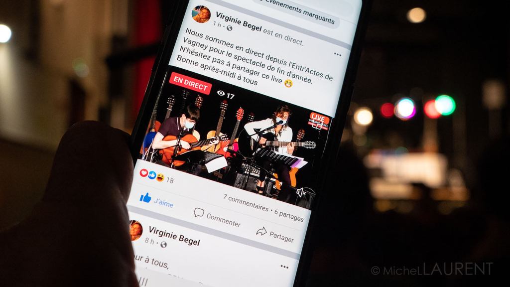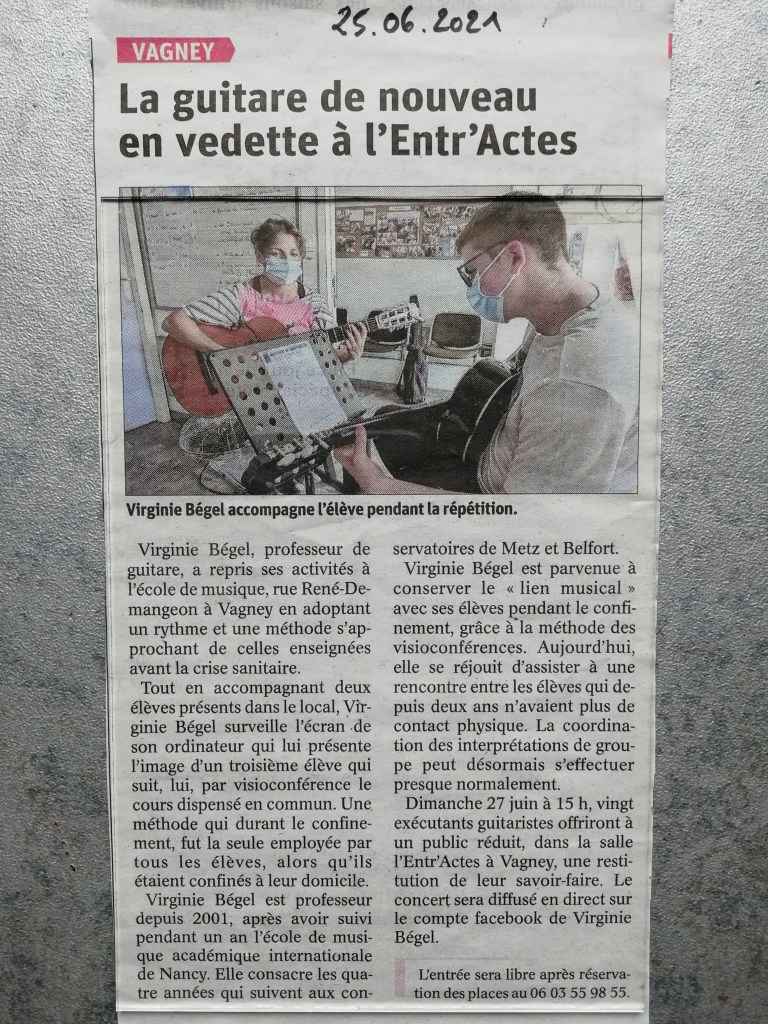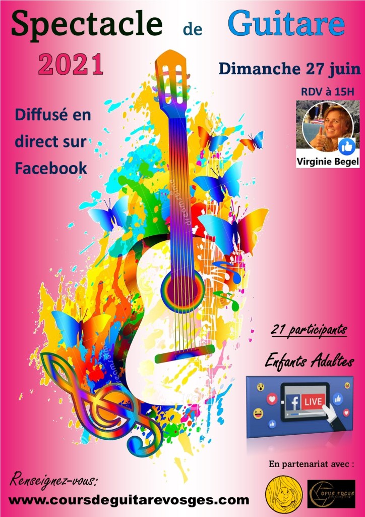 Spectacle de fin d’année 2021 17 avril 202128 juin 2021 coursdeguitarevosgesLaisser un commentaire L’école de guitare vous invite à son spectacle de fin d’année en « Streaming Live Internet » le dimanche 27 juin 2021 à 15H.21 participants, organisé par Virginie BEGEL professeur de guitare.Ce spectacle se déroulera à la salle l’Entr’Actes de Vagney (88), filmé par la société www.opusfocusproductions.com